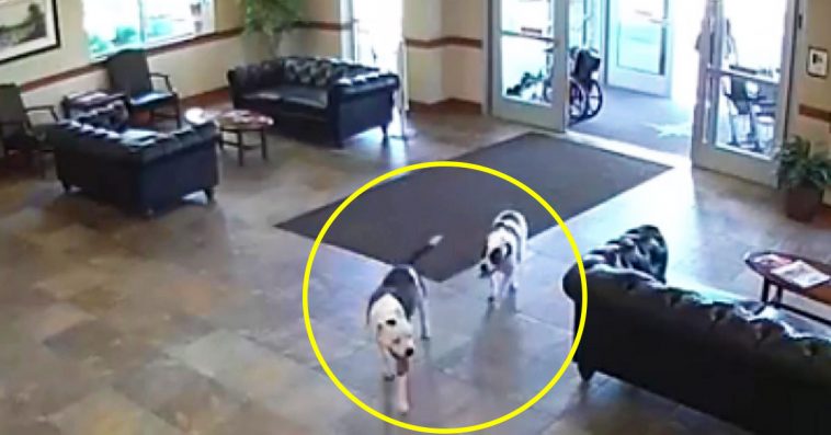 Surveillance footage released by the hospital shows two Pit Bulls casually walking into the hospital just like any human would, and start strolling around.