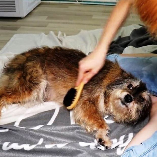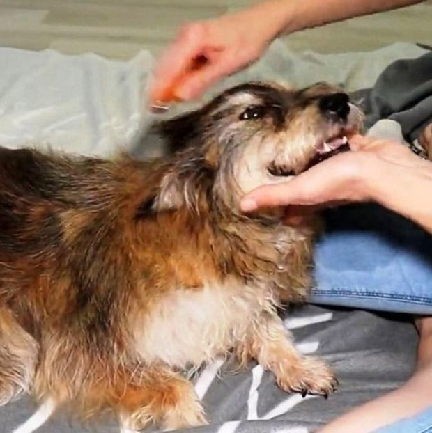 The dog was scared at first, but sensed the woman’s good intentions and eventually surrendered his fate in her hands!