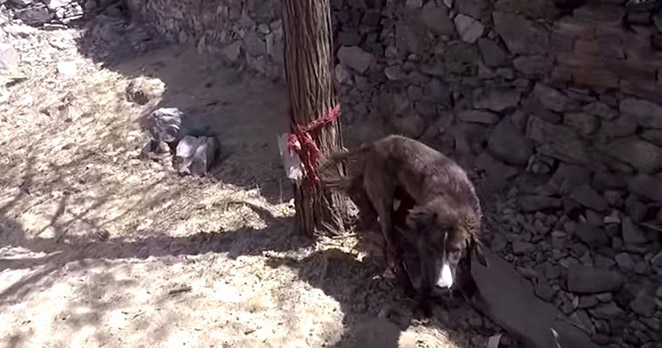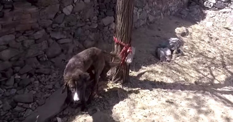 Animal Aid Unlimited received a call from some villagers about a dog who was injured and suffering. They tied him to a tree to make sure he wouldn’t get away.