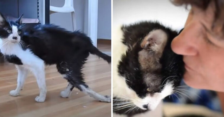 Nothing can compete with the eternal love between a cat and a human being when it is meant to be, even if that’s a matter of distance. A stray kitty named Frog was recorded wandering around the urban area in southern Greece with his poor hind legs, a broken back spine made him fiercely drag with a limp. He was also considered extremely malnourished. Frog the cat was so tiny and alone, hoping someone would help him out of the misery.