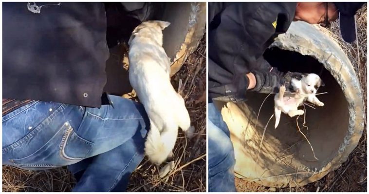 One of the rescuers, named Will, was able to crawl inside the pipe and gently grab all of the puppies – three girls and two boys.