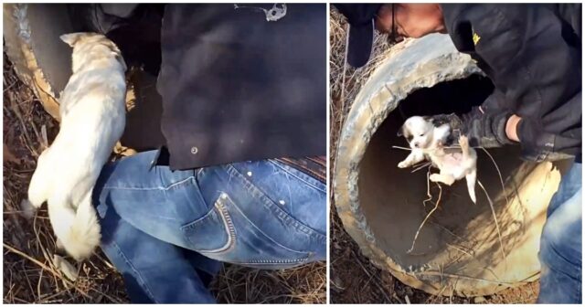 The mom went into the pipe, and rescuers thought she would carry her puppies out herself, but she turned around and walked back toward the rescuers.