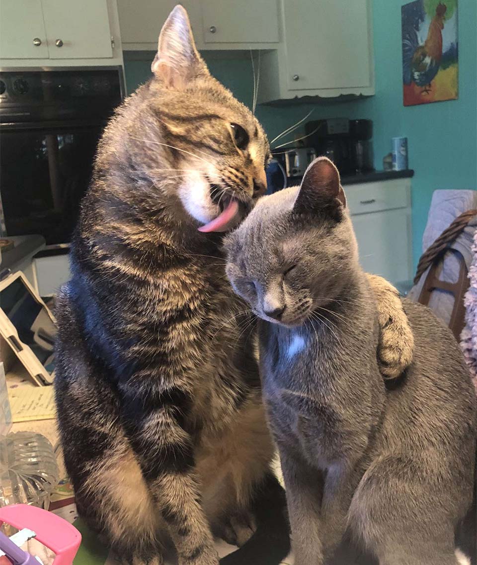 Buddy has grown more confident, extroverted, and social as a result of his adopted sister’s companionship. He’s also gentler, and the six rescued cats have merged into one huge loving family, with no cat left alone at bedtime.