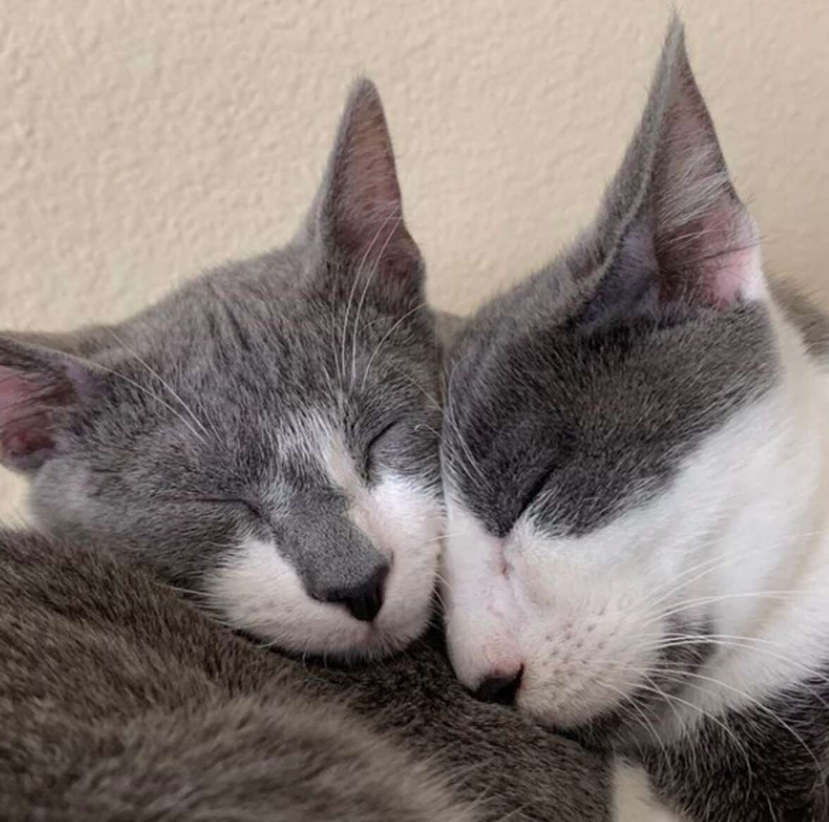 River is almost twice Remi’s size and serves as his protector, according to Duda. “Remi wanted to sit in a huge potted plant in our dining room the other day. Remi was irritated because I had put foil in the pot to keep the kittens from playing in the mud. River kindly removed the foil for Remi, allowing him to lie in the dirt.”