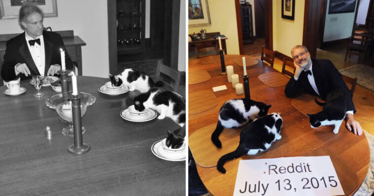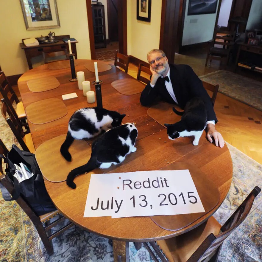 On Imgur, he confessed: “It’s girls week at the beach with her old high school friends. No way I want to be part of that… Six days into her vacation I joked ‘I’m going to have a formal dinner with the cats.’ Then I thought about it for a while…”