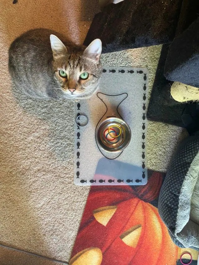 #39 Weirdo keeps throwing hair ties in his water and food bowls.