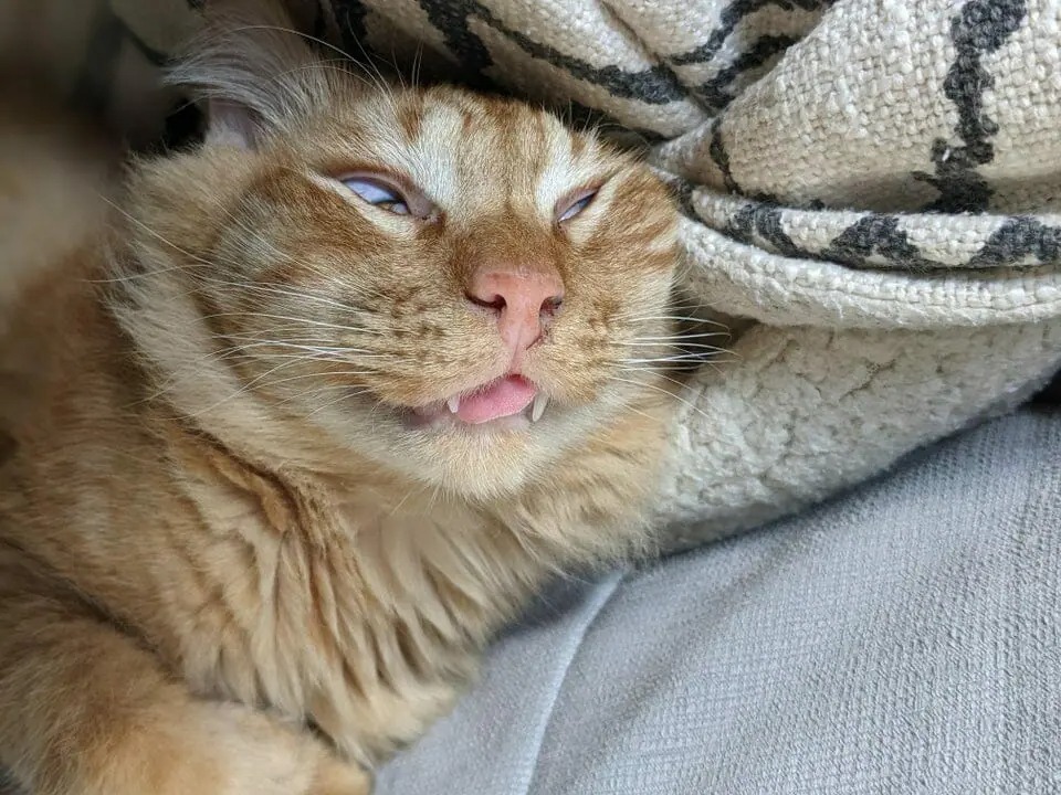 #3 This is Dr. Indiana Jones. He sleeps like he’s dead. The blep happens about 70% of the time, teefies about 40%, rarely the eyes, but all three I couldn’t not capture!