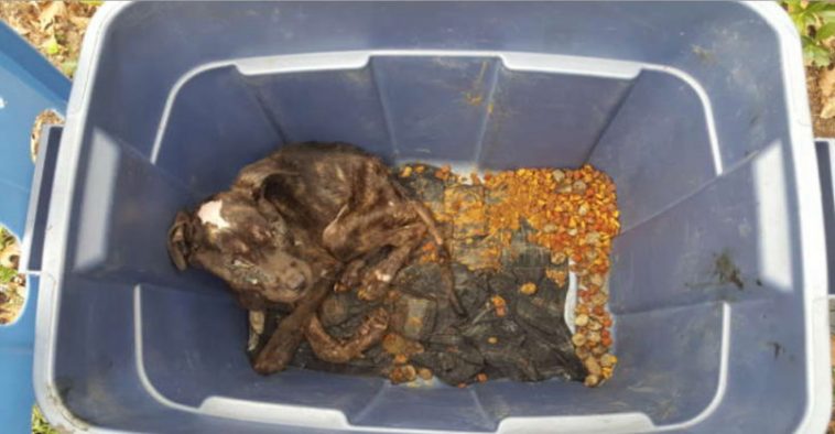 The poor puppy you see in this plastic tub was found recently on the side of the roadway in Columbia, Maryland, the cover was removed before the picture was taken.