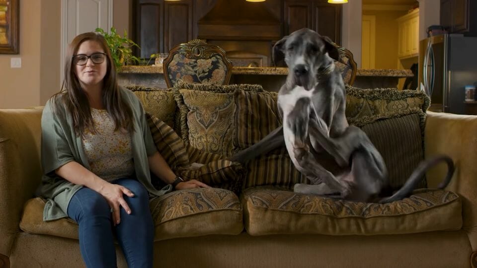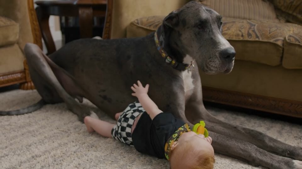 But despite being so big, Zeus is a gentle dog who is kind to dogs of all shapes and sizes, and to the family’s baby. He shares his home with three miniature Australian Shepherds, who he likes playing with, and a cat named Penelope, with whom he has an agreement to “stay away from each other.”