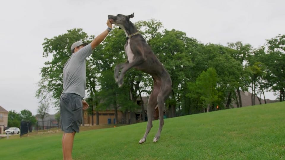 Zeus’ huge size makes having him around the house a unique experience. “His water bowl is a sink, and he loves to jump onto the fence and talk to the neighbour’s dogs next door,” Brittany says.