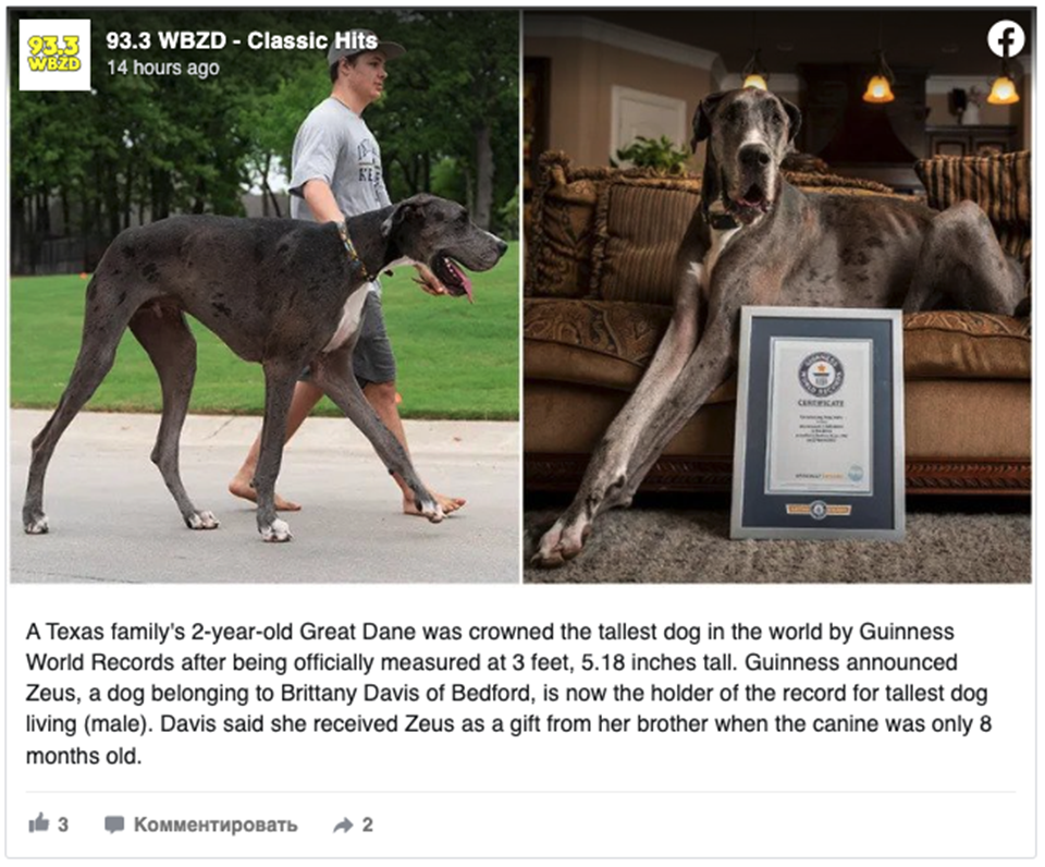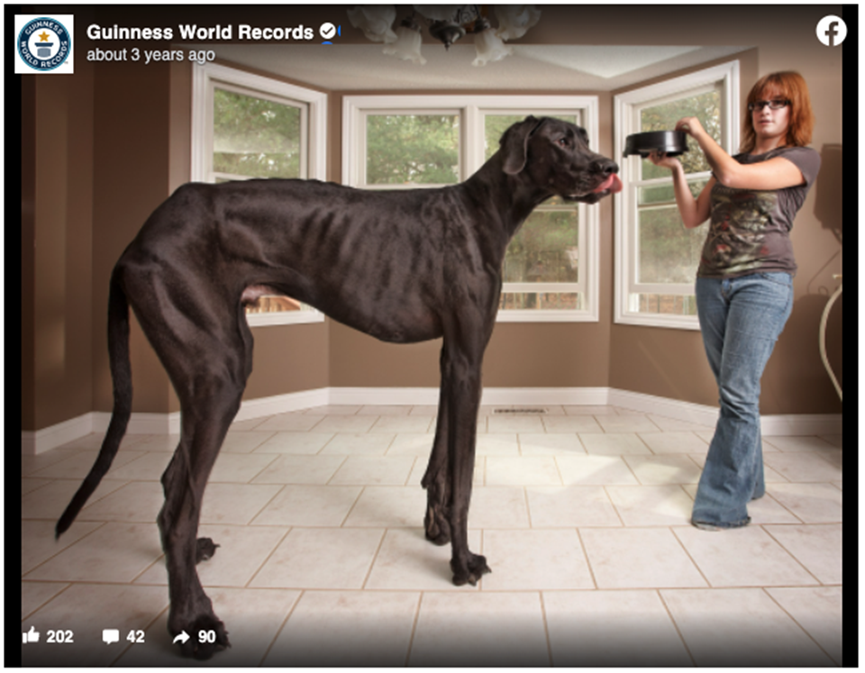 Maybe it’s just in the name: It turns out that the previous record-holder was also a Great Dane named Zeus, from Otsego, Michigan. The elder Zeus passed away in 2014 at the age of 5.
